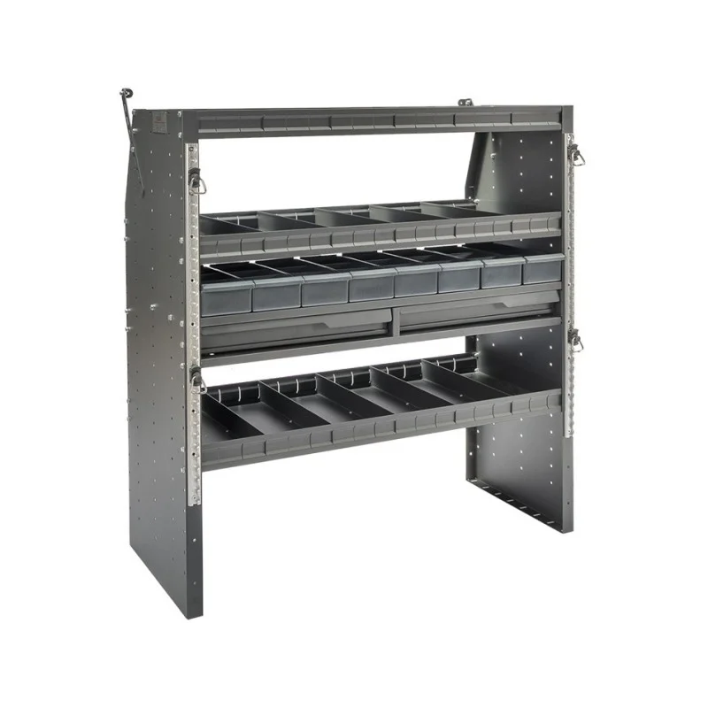 Universele plaatstalen kast met 2 lades, meerdere open vakken en 8 plastic bakjes voor inbouw in bus, vrachtwagen of boot. Deze representatieve antraciet / matzwart gecoate inbouwkast past in vrijwel alle bestelwagens in de lengtes L2, L3 en L4. Heeft u een L1 voertuig kom dan geheel vrijblijvend langs om te checken of één van de Powerplustools inbouwkasten past.