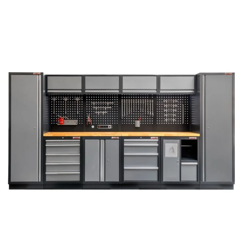 Complete Werkplaatsinrichting, houten blad, gereedschapskast, gereedschapsbord matzwart, 4 x hangkast,10 laden, 392 x 200 cm.