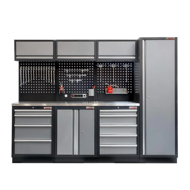 Werkbankset - met RVS plaat omkleed werkblad, gereedschapsbord matzwart, werkplaatsinrichting, 9 laden - 264 x 46 x 94,6 cm