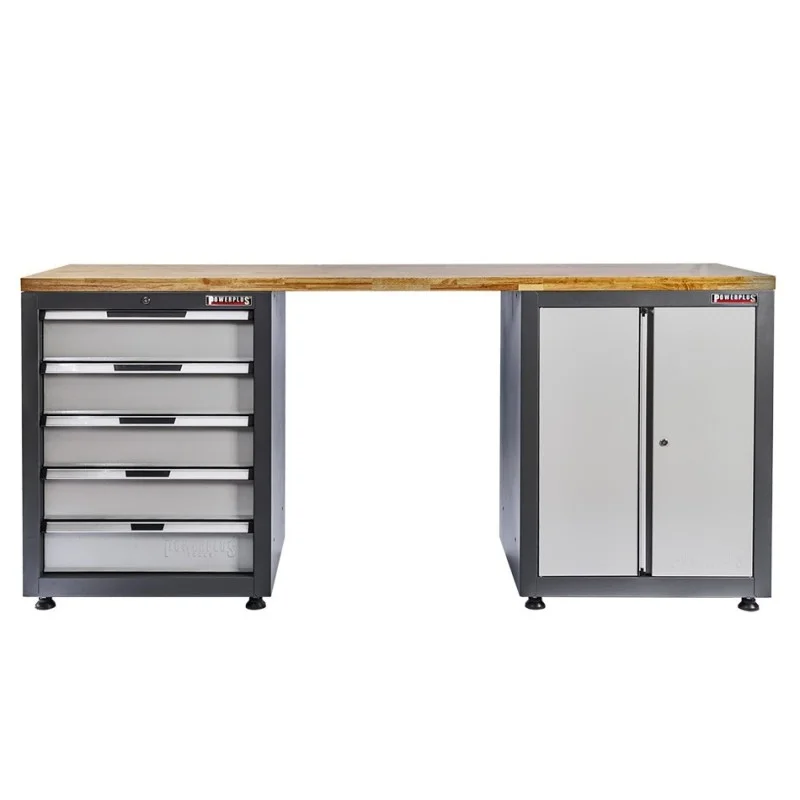 Deze Elite line werkbank met vijf laden blok en tweedeurskast heeft een robuuste uitstraling en past qua kleurstelling in vele interieurs. Deze representatieve en zeer degelijke set met een hardhouten werkblad van 210 x 55,5 x 4 cm. is gemaakt voor professioneel gebruik.