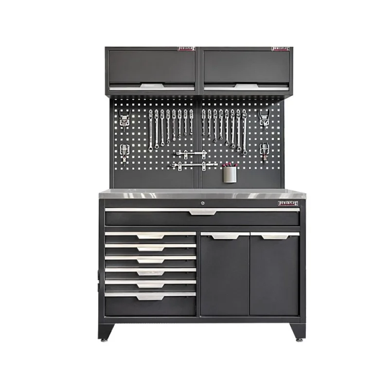 Gereedschapskasten set wandlengte 136 cm. brede 7 laden kast, metaal omkleed werkblad, hangkasten, gereedschapsborden matzwart .
