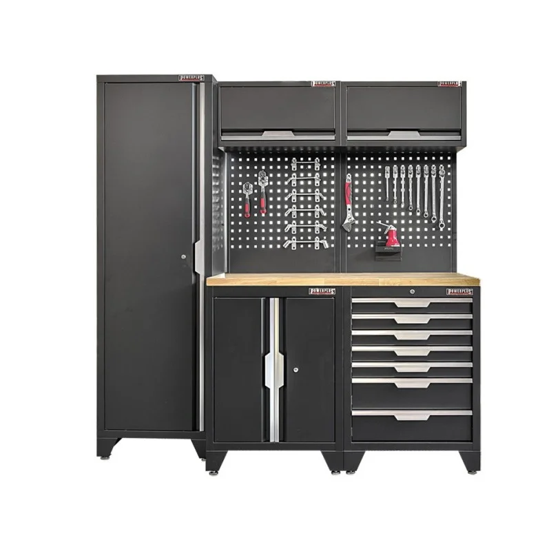 Gereedschapskasten set wandlengte 196 cm. tweedeurs kast, hangkast, hoge kast, gatenwand, matzwart.