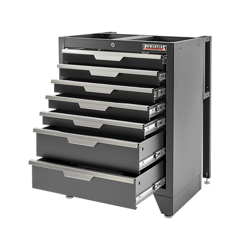 1 x Werkplaatskast PP-T 2884 met 7 laden, de meest populaire uitvoering met 5 ondiepe en 2 diepe laden. Ook deze kast wordt geleverd met 4 verstelbare pootjes in het basisframe waarmee oneffenheden in de vloer kunnen worden opgevangen.