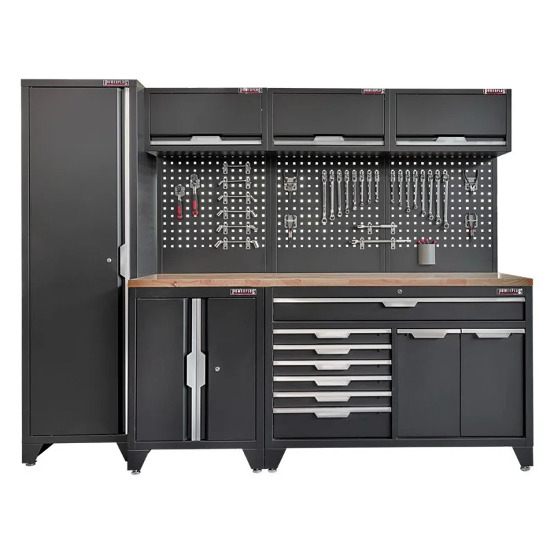 Gereedschapskasten set wandlengte 264 cm. hoge kast, 7 laden kast, hangkast, gereedschapswand, matzwart.