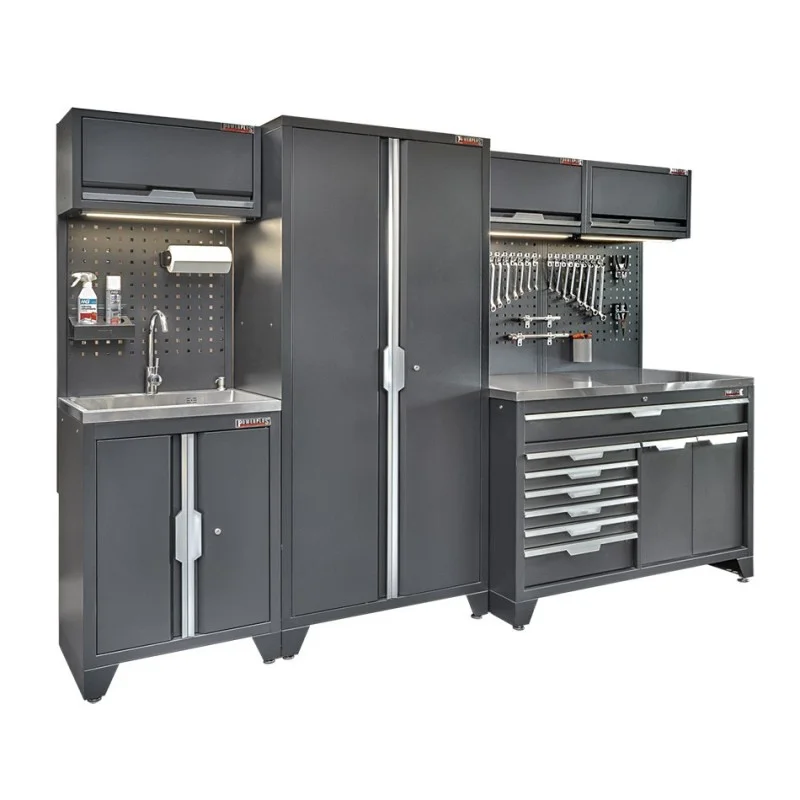 Gereedschapskasten set wandlengte 295,5 cm, hoge tweedeurs kast, brede 7 laden kast, hangkasten, gatenwand, wasbak, matzwart.