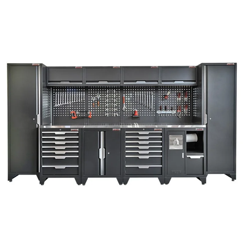 Gereedschapskasten set wandlengte 392 cm. metaal omkleed werkblad, tweedeurs kast, 7 laden kasten, hoge kasten, matzwart.