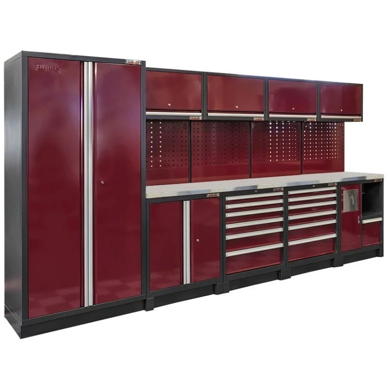 Complete werkplaatsinrichting donker rood, RVS blad, gereedschapskast, 4 x hangkast,12 laden, 379,5 x 200 cm