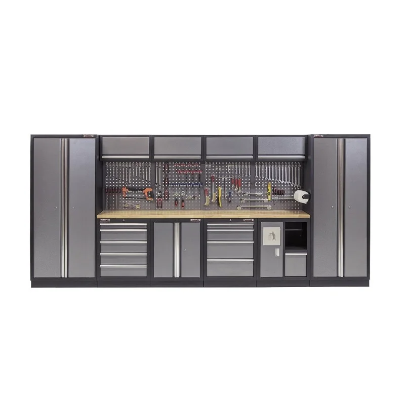Complete Werkplaatsinrichting, werkbank houten blad, gereedschapskast, gereedschapsbord, 4 x hangkast,10 laden, 455 x 200 cm.