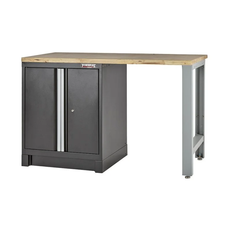 Heavy Duty werkbank met hardhouten werkblad, grijs pootstel en werkplaatskast zwart - 144 x 60 x 94 cm