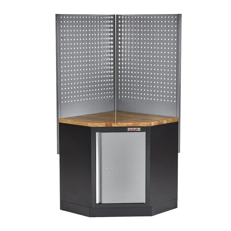 Hoekstuk garageserie met hardhouten werkblad en gereedschapsbord