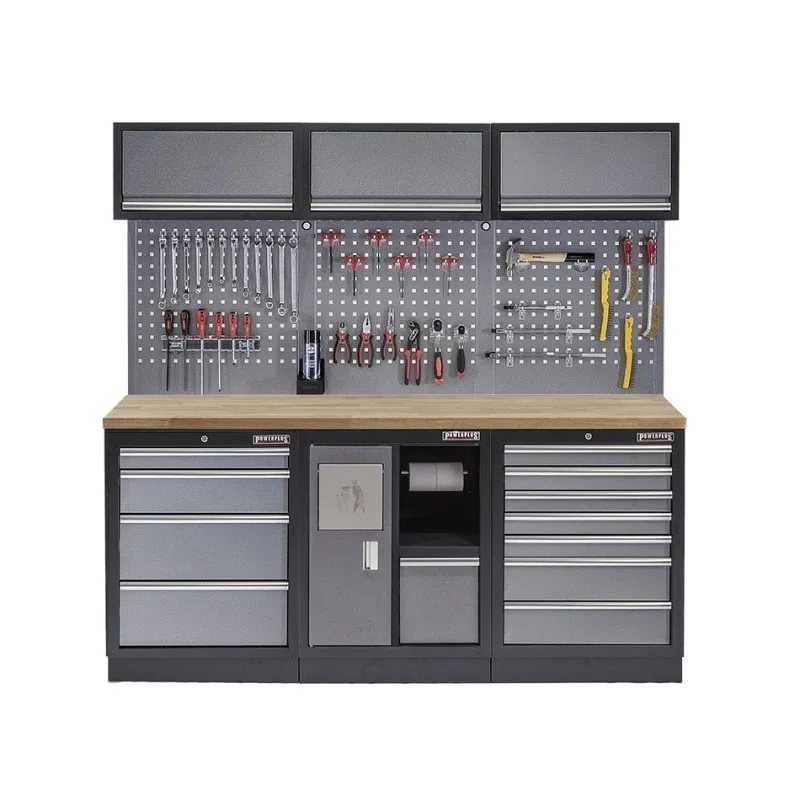Werkbank set met gereedschapswand, werkplaatsinrichting, gereedschapsbord, 3 x hangkast en 12 laden - 204 x 46 x 200 cm