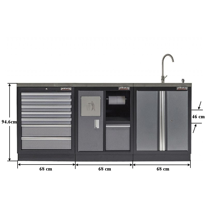 Plus Werkplaatskast met 2 deuren inclusief zeeppomp, RVS wasbak en RVS kraan.