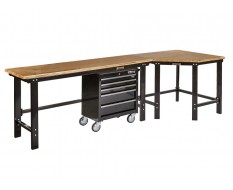 Werkbank hoekopstelling van 310 cm lang bestaande uit: 1 Gereedschapswagen met 5 kogelgelagerde laden en uniek snelsluitsysteem per lade. 1 Degelijke werkbank afm. 200 x 61 x 95 cm. en een hoekstuk afm. 110 x 110 x 95 cm. voorzien van een 3,6 cm. dik vingerlas verlijmd hardhouten blad welke ook onder extreme omstandigheden niet krom trekt. Capaciteit...