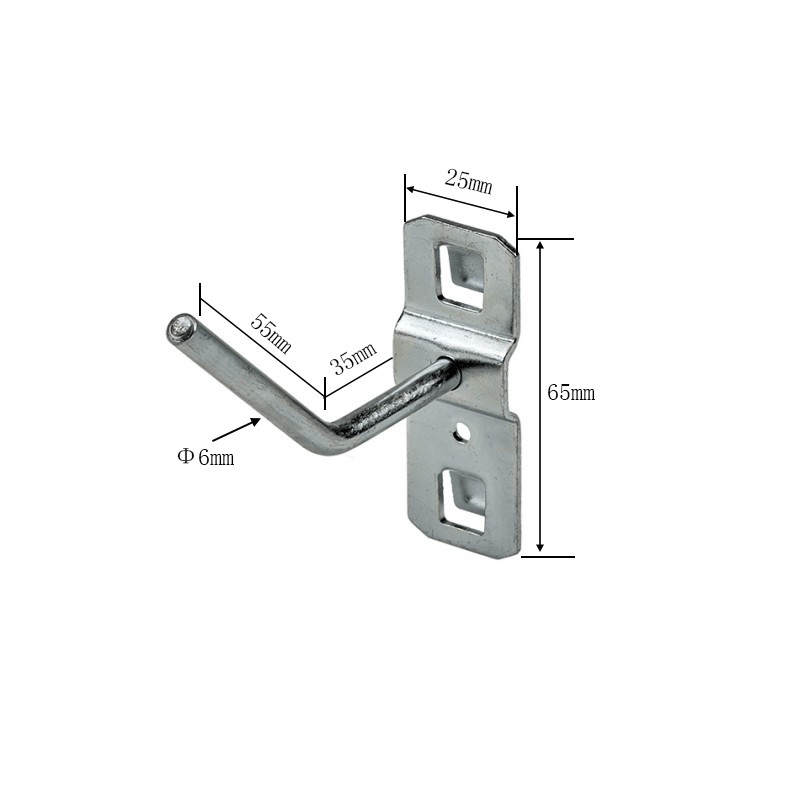 Haak enkel voor het ophangen van gereedschappen e.d. aan alle types gereedschapsborden van Powerplustools. Haaklengte 8 cm. Diameter: Ø 5 mm. Totale breedte: 56 mm. Totale hoogte: 66 mm. Materiaal: 1,5 mm. dik gegalvaniseerd plaatstaal.
