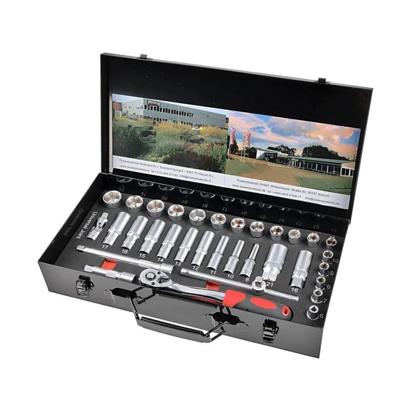 De doppenset bestaat uit 33 onderdelen, inclusief een 3/8 inch omkeerbare ratel en verlengstukken. Deze set wordt geleverd in een EVA soft foam inlay, die zorgt voor orde en overzicht en beschermt de gereedschappen tegen beschadiging.