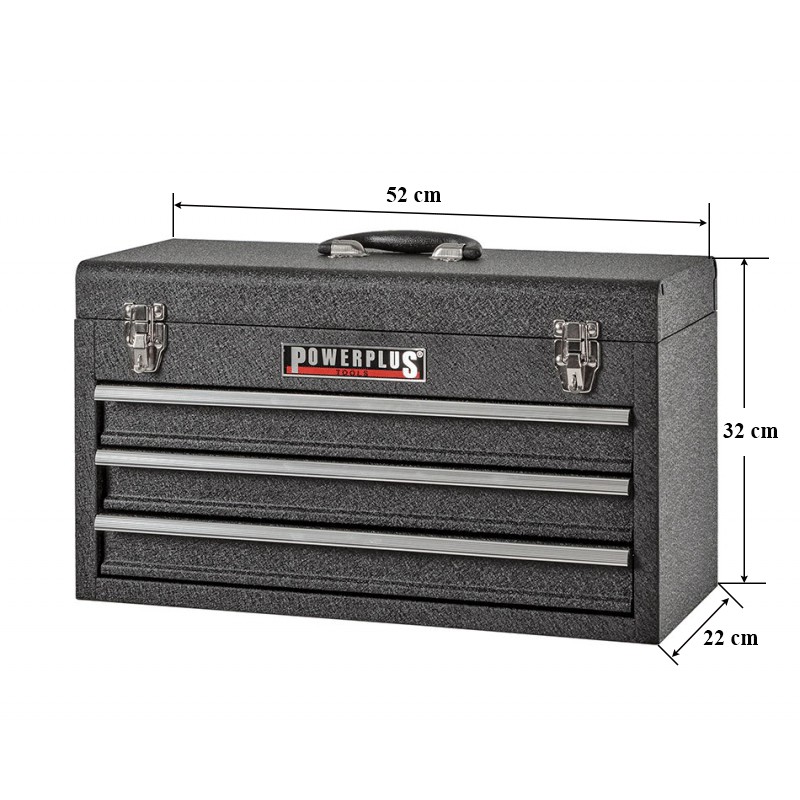 Gereedschapskist zwart met drie laden en afsluitbaar deksel met handvat. Kleur: glanzend zwart, hoogwaardige poedercoating (tevens leverbaar in mat/wrinkled zwart onder art. nr. PP-T 2816S2). Afmetingen: 52 x 22 x 32 cm. ( buitenmaten B x D x H ) Netto gewicht: 8,85 kg. Centrale ladenblokkering d.m.v. het sluiten van het deksel.