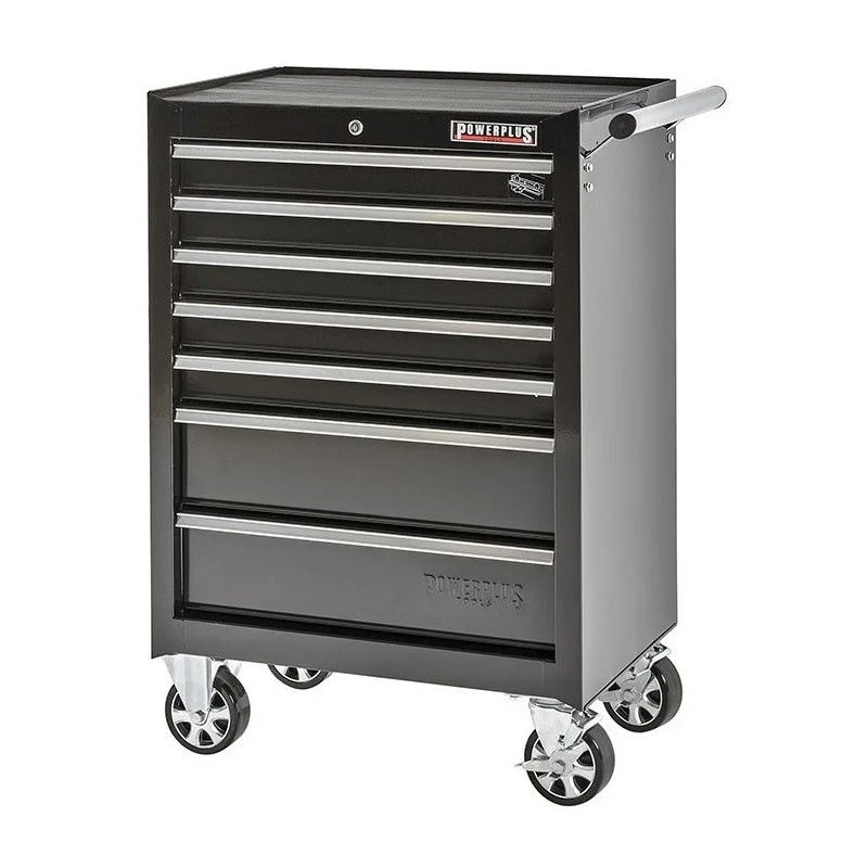 Zeer degelijke gereedschapswagen met 7 laden waarvan 4 laden gevuld zijn met 81 kunststof opbergbakjes.