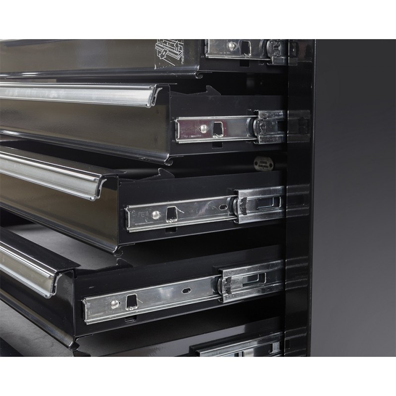 Degelijke gereedschapkist met 9 kogelgelagerde laden. Afsluitbaar door middel van sleutel en centrale ladenblokkering en de onderste 3 laden beschikken over uniek snelsluitsysteem. Kleur zwart Kunststof matten in de laden. 6 laden met binnenafmetingen 16,5 x 27 x 4,5 cm. 2 laden met binnenafmetingen 57 x 27 x 4,5 cm. 1 lade met binnenafmetingen 57 x 27...