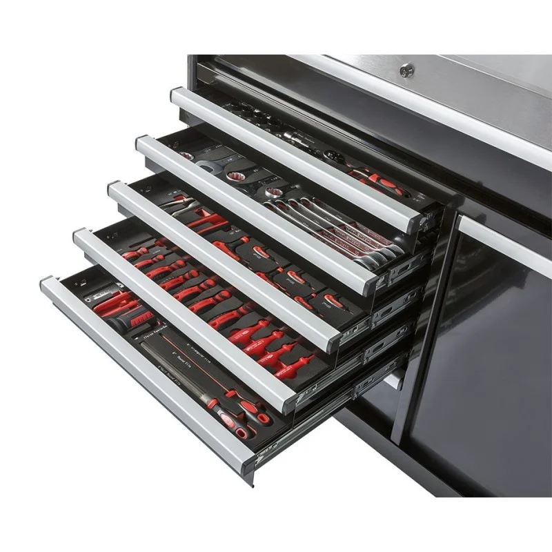 Een professionele gereedschapswagen met daarin 159 gereedschappen met levenslange garantie in overzichtelijke module. De gereedschappen zijn gemaakt van Chrome Vanadium met evt. een breukbestendig kunststof handvat, de modules met maatgegevens van het desbetreffende gereedschap er op geprint zijn gemaakt van Ethyleen Vinyl Avetaat ( EVA foam mat ) dit is een zacht, flexibel, taai, UV- en weerbestendig, lichtgewicht en slijtvast materiaal en speciaal ontwikkeld voor dit doel. Voordeel van EVA foam is dat zowel de buitenkant als de binnenkant van het zelfde materiaal is gemaakt, als het materiaal evt. zou scheuren neemt ook de binnenkant geen vocht op.