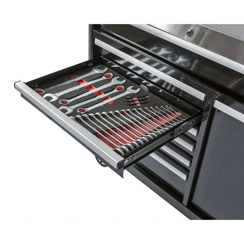 Een professionele gereedschapswagen met daarin 159 gereedschappen met levenslange garantie in overzichtelijke module. De gereedschappen zijn gemaakt van Chrome Vanadium met evt. een breukbestendig kunststof handvat, de modules met maatgegevens van het desbetreffende gereedschap er op geprint zijn gemaakt van Ethyleen Vinyl Avetaat ( EVA foam mat ) dit is een zacht, flexibel, taai, UV- en weerbestendig, lichtgewicht en slijtvast materiaal en speciaal ontwikkeld voor dit doel. Voordeel van EVA foam is dat zowel de buitenkant als de binnenkant van het zelfde materiaal is gemaakt, als het materiaal evt. zou scheuren neemt ook de binnenkant geen vocht op.