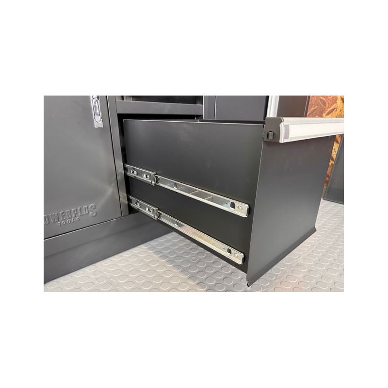 1 diepe lade met dubbele kogellagering, afm. 29,5 x 46 x 27 cm. ( binnenmaten gemeten B x D x H ).