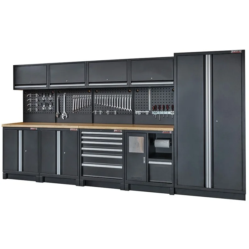 Complete werkplaatsinrichting mat zwart, werkbank + hardhouten blad, gereedschapskast, 6 laden, 379,5 x 200 cm