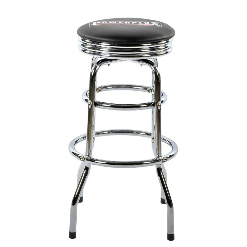 Materiaal: verchroomd stalen buizenframe Ø 25 mm .– MDF zitting Ø 36 cm. x 8 cm. omkleed met schuimrubber, zwart skai kunstleer en chique verchroomde rand.