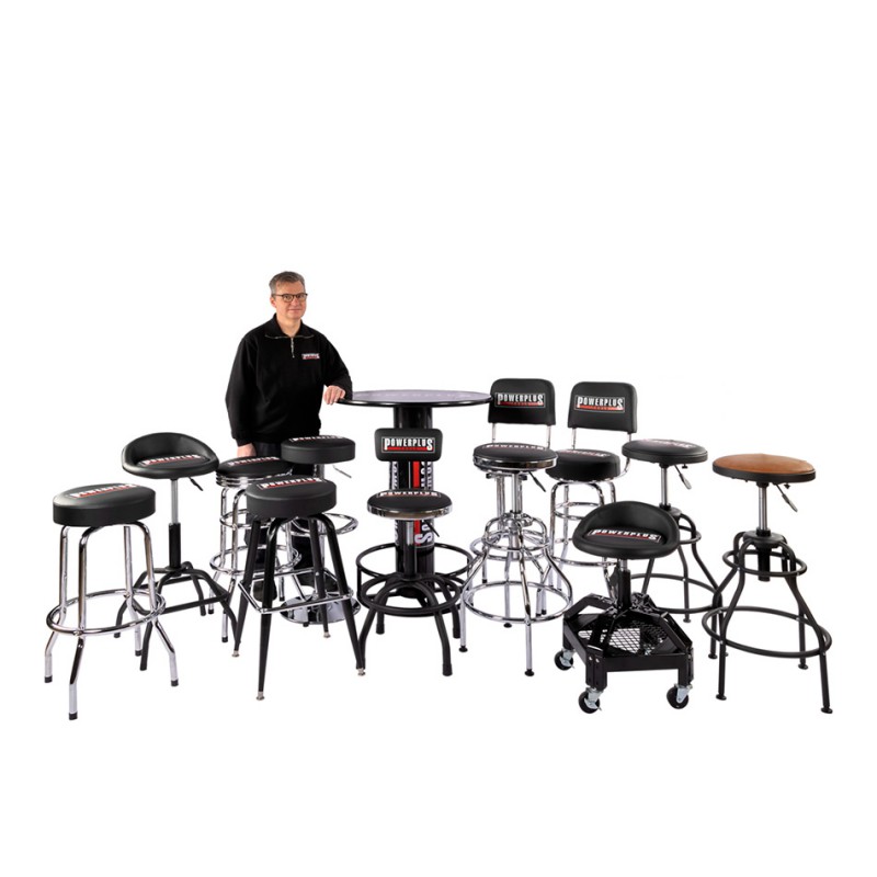 Materiaal: verchroomd stalen buizenframe Ø 25 mm., buizen van de rugleuning Ø 19 mm. – MDF zitting Ø 36 cm. x 8 cm. omkleed met schuimrubber en zwart skai kunstleer. Afmetingen rugleuning 37 x 25 x 6 cm. (B x H x D).