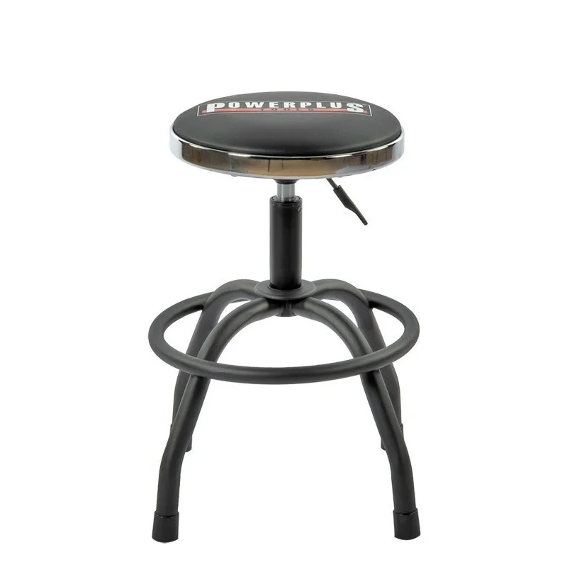 Materiaal: zwart stalen buizenframe Ø 32 en Ø 19 mm.– MDF zitting Ø 36 x 6 cm. met verchroomde metalen ring en omkleed met schuimrubber en zwart skai kunstleer.