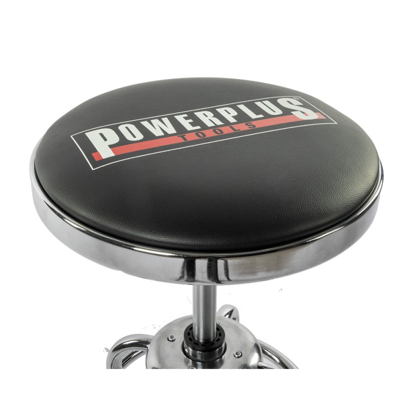 Materiaal: verchroomd stalen buizenframe Ø 21 mm. – MDF zitting Ø 36 cm. x 6 cm. met verchroomde rand en omkleed met schuimrubber en zwart skai kunstleer.