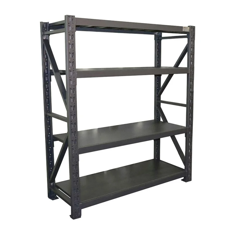 Degelijke ijzeren magazijnstelling met 4 plaatstalen legborden.