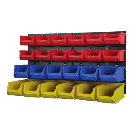 Set van 24 kunststof magazijnbakjes met metalen wandhouder, multifunctioneel opbergsysteem met kunststof magazijnbakken.