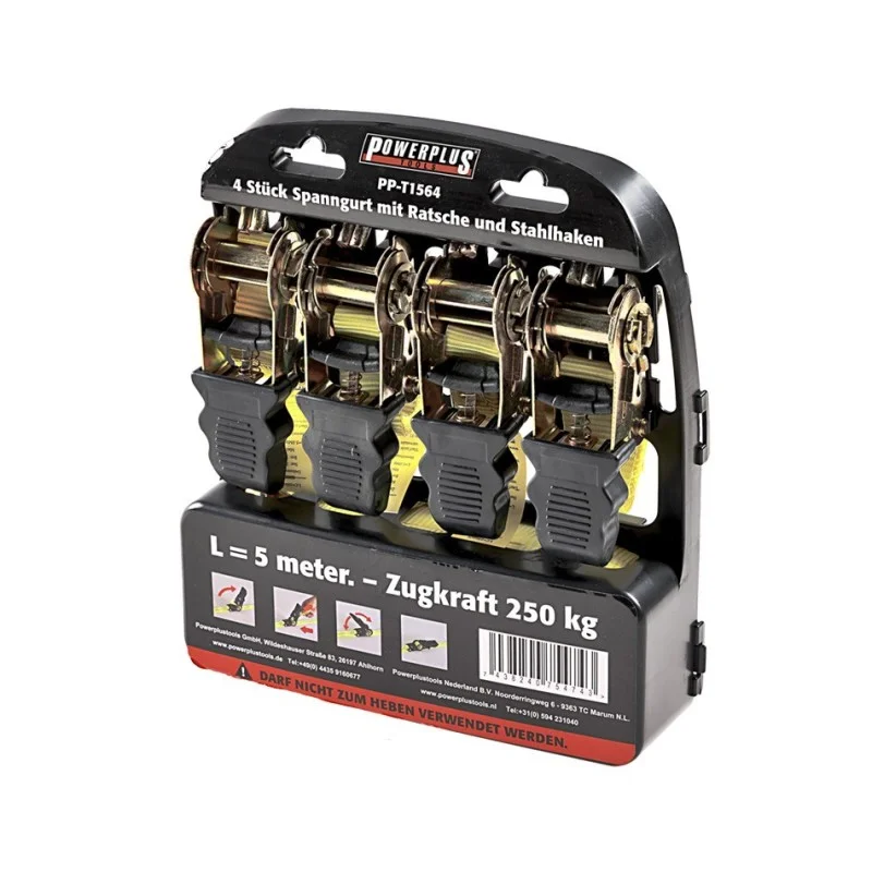 4 handige nylon spanbanden met ijzeren haak en ratelsysteem gemaakt van 100 % polyester.