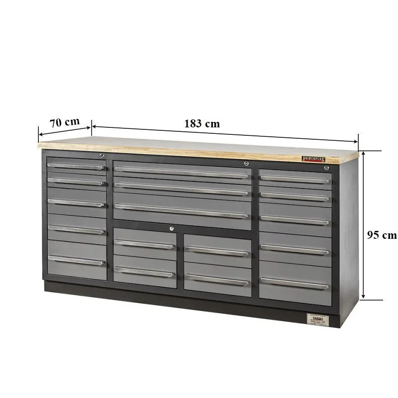 Een sieraad voor iedere werkplaats, deze degelijke werkbank met extra grote lades en houten werkblad. Dit hoogwaardige product heeft als basis een gelast frame en wordt compleet gemonteerd geleverd. De 17 lades zijn uitgerust met heavy duty kogellager-geleidingen, zijn volledig uitschuifbaar en voorzien van 2,5 mm. dikke foam matten.