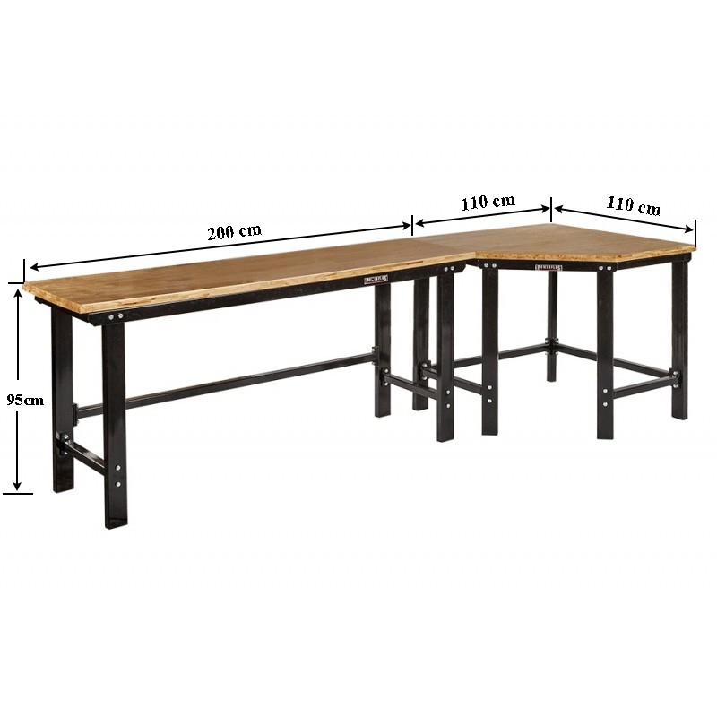 Topkwaliteit werkbank hoek opstelling van Powerplustools met oerdegelijk ijzeren frame en poten van dikwandig kokerprofiel (80 x 40 mm.) Deze professionele zware werkbank wordt geleverd inclusief een glad gelakt vingerlas verlijmd hardhouten blad van 3,6 cm. dik. Een ideale stalen werkbank voor school, autogarage, werkplaats, particulier. Deze industrieel inzetbare werkbank hoekopstelling is verkrijgbaar in de kleuren grijs en zwart en is zowel aan de linker als de rechterkant uit te breiden met werkbanken in lengtes van 100 - 120 - 150 en 200 cm. De hoogwaardige poedercoating is UV bestendig en het frame wordt samen geschroefd met gegalvaniseerde bouten en moeren (boutkwaliteit 4.8 )
