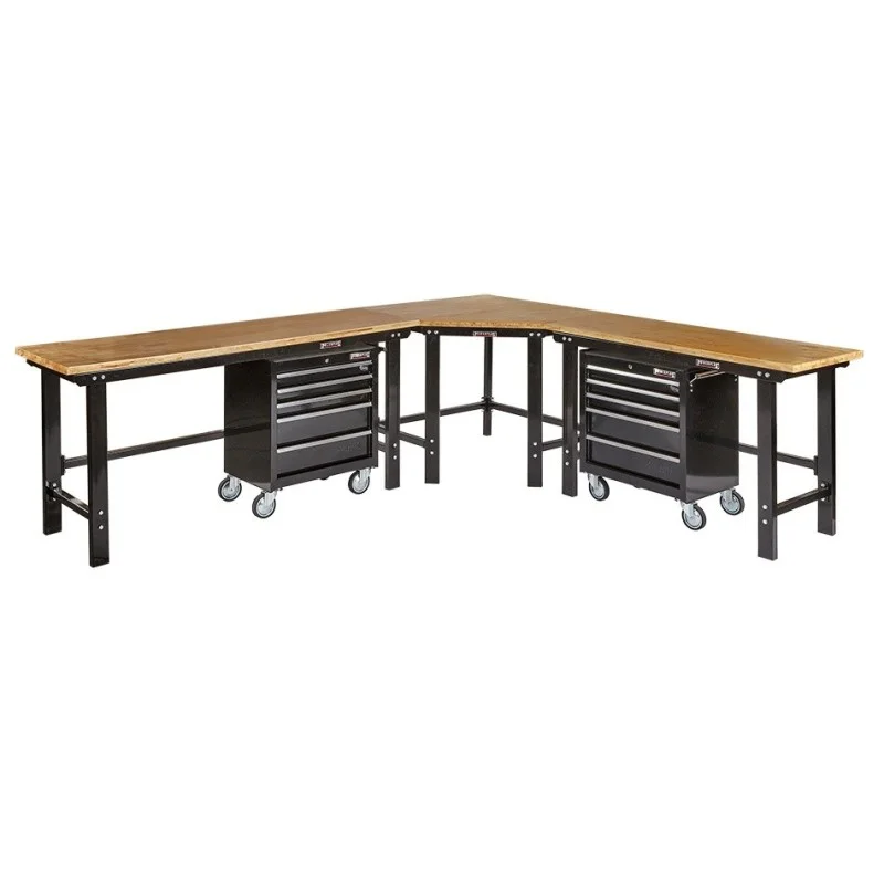 Werkbank hoekopstelling - Hoek werkbank 310 cm x 260 cm zwart met hardhouten blad en 2 gereedschapswagens