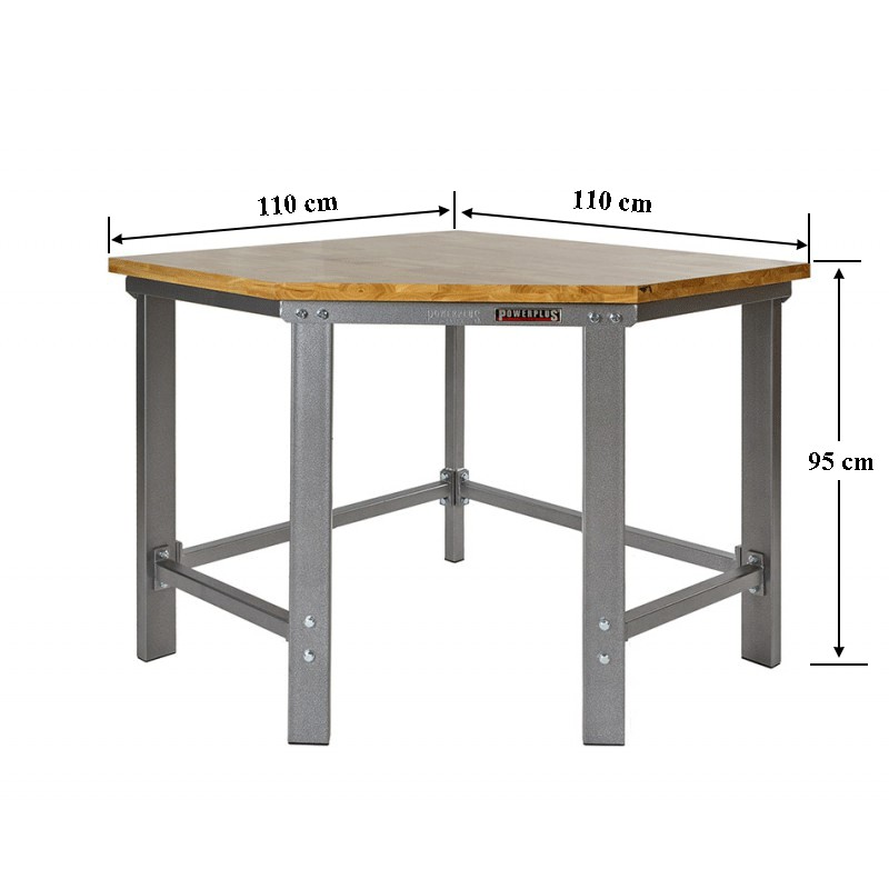 Topkwaliteit werkbank hoekopstelling van Powerplustools met oerdegelijk ijzeren frame en poten van dikwandig kokerprofiel (80 x 40 mm.) Deze professionele zware werkbank wordt geleverd inclusief een glad gelakt vingerlas verlijmd hardhouten blad van 3,5 cm. dik. Een ideale stalen werkbank voor school, autogarage, werkplaats, particulier. Deze industrieel inzetbare werkbank hoekopstelling is verkrijgbaar in de kleuren hamerslag grijs en glanzend zwart en is zowel aan de linker als de rechterkant uit te breiden met werkbanken in lengtes van 100 - 120 - 150 en 200 cm. De hoogwaardige poedercoating is UV bestendig en het frame wordt samen geschroefd met gegalvaniseerde bouten en moeren (boutkwaliteit 4.8 )