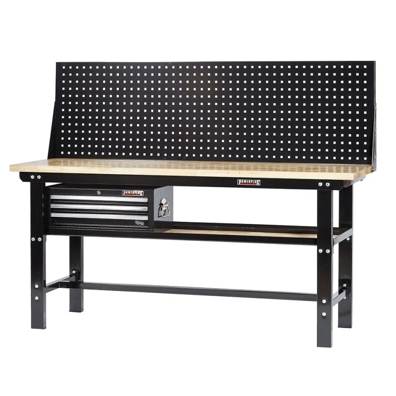 Topkwaliteit werkbank van Powerplustools met oerdegelijk ijzeren frame en poten van dikwandig kokerprofiel (80 x 40 mm.) Deze professionele zware werkbank wordt geleverd inclusief een glad gelakt vingerlas verlijmd hardhouten blad van 3,6 cm. dik. Een ideale stalen werkbank voor school, autogarage, werkplaats, particulier. Deze industrieel inzetbare werkbank is verkrijgbaar in de kleuren rood en zwart. De hoogwaardige poedercoating is UV bestendig en het frame wordt samen geschroefd met gegalvaniseerde bouten en moeren (boutkwaliteit 4.8 )