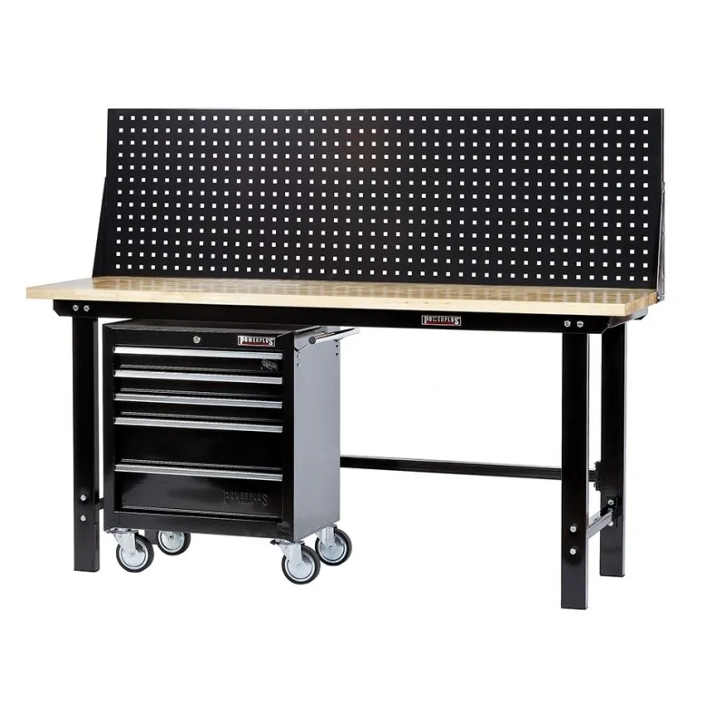 Topkwaliteit werkbank van Powerplustools met oerdegelijk ijzeren frame en poten van dikwandig kokerprofiel (80 x 40 mm.) Deze professionele zware werkbank wordt geleverd inclusief een glad gelakt vingerlas verlijmd hardhouten blad van 3,6 cm. dik. Een ideale stalen werkbank voor school, autogarage, werkplaats, particulier. Deze industrieel inzetbare werkbank is verkrijgbaar in de kleuren grijs en zwart. De hoogwaardige poedercoating is UV bestendig en het frame wordt samen geschroefd met gegalvaniseerde bouten en moeren (boutkwaliteit 4.8 )