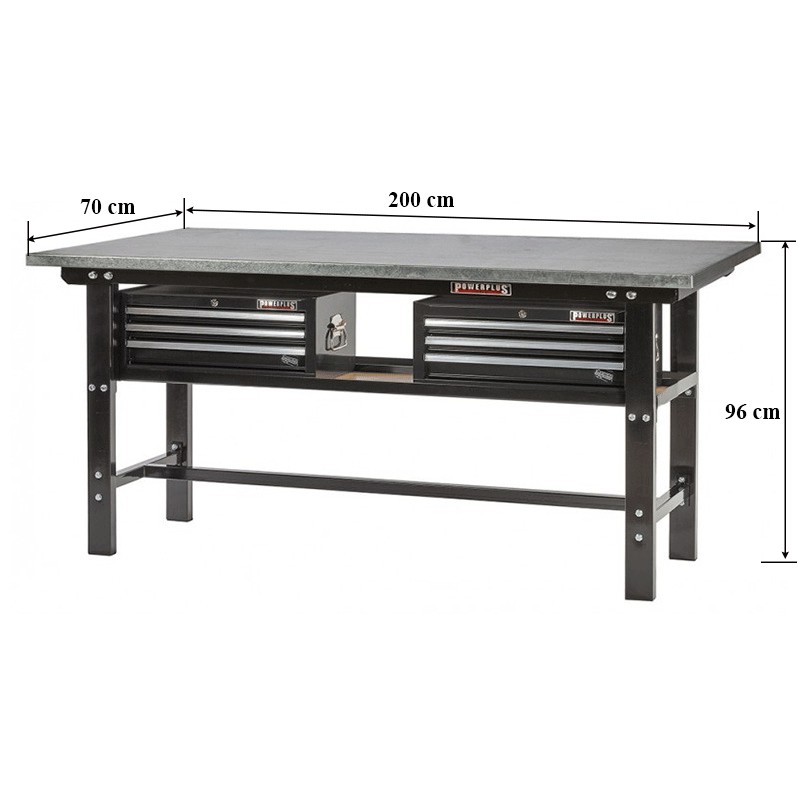 Topkwaliteit werkbank van Powerplustools met oerdegelijk ijzeren frame en poten van dikwandig kokerprofiel (80 x 40 mm.) Deze professionele zware werkbank wordt geleverd inclusief een geperst houten blad met daaromheen een metalen plaat. Een ideale stalen werkbank voor school, autogarage, werkplaats, particulier. Deze industrieel inzetbare werkbank is verkrijgbaar in de kleuren rood en zwart. De hoogwaardige poedercoating is UV bestendig en het frame wordt samen geschroefd met gegalvaniseerde bouten en moeren (boutkwaliteit 4.8 ) Advies voor montage van een bankschroef: werkblad doorboren met een Ø 6 mm. boor en bankschroef monteren met M6 bouten, aan de onderzijde grote platte ijzeren ringen of ijzeren plaat monteren en daarna stevig vastzetten met moeren.
