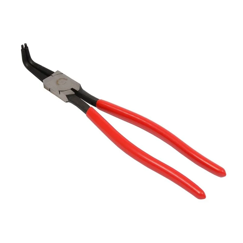 Extra lange circliptang, seegerringtang, borgveertang met gebogen haakse bek voor binnenringen.