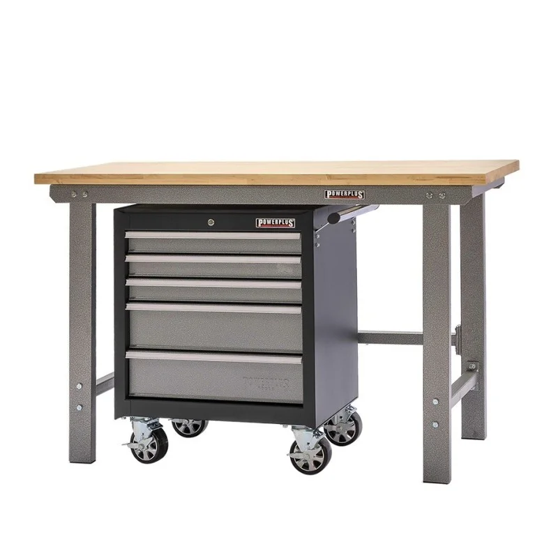 Werkbank grijs 150 cm met hardhouten blad en gereedschapswagen