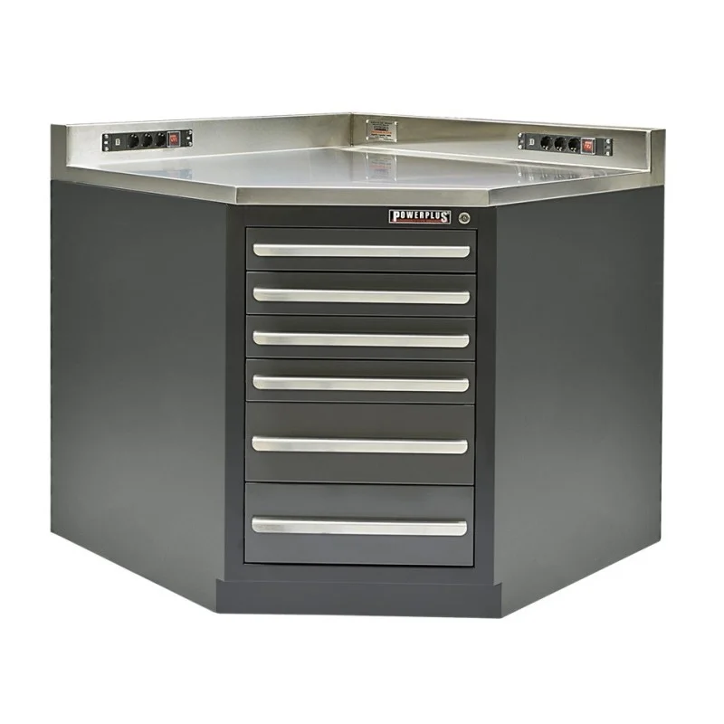 Een mooie aanvulling op de werkbanken PP-T 2740 – 2741 en 2742 is dit passende hoekstuk met 6 grote lades. Het geheel is voorzien van een luxe RVS bovenblad. Deze hoogwaardige werkbank heeft als basis een gelast frame en wordt compleet gemonteerd geleverd.