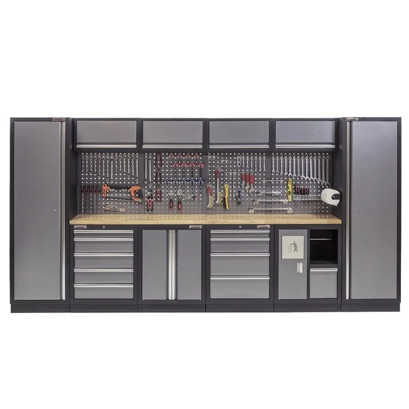 Complete Werkplaatsinrichting, werkbank houten blad, gereedschapskast, gereedschapsbord, 4 x hangkast,10 laden, 392 x 200 cm.