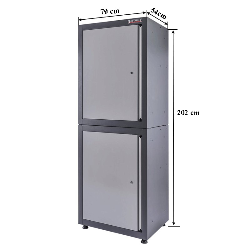 Zeer degelijke, industrieel inzetbare, werkplaatskast met twee boven elkaar geplaatste deuren. Met het uiterlijk van een koel – vriescombi een sieraad voor uw werkplaats, het schuurtje of als opbergruimte in de bijkeuken.