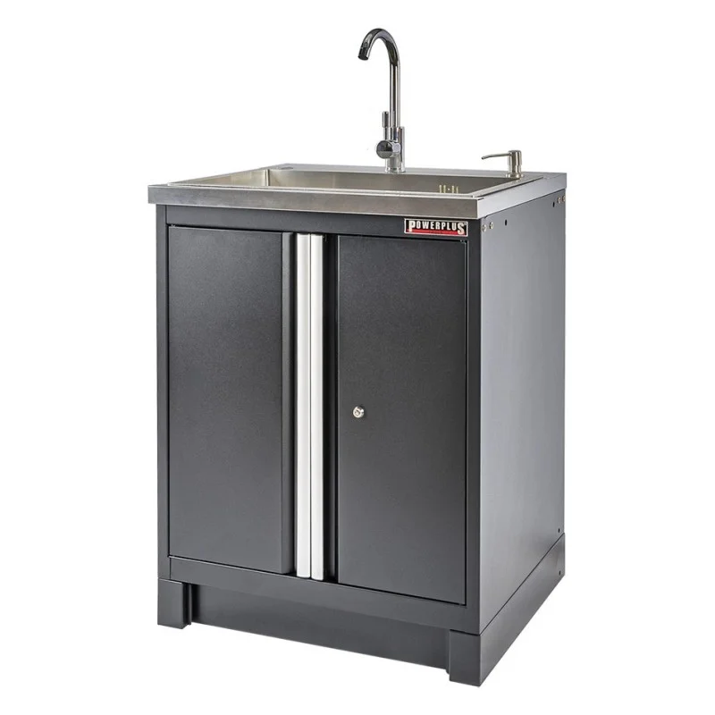 Werkplaatskast matzwart met 2 deuren, RVS wasbak, zeeppomp en kraan.
