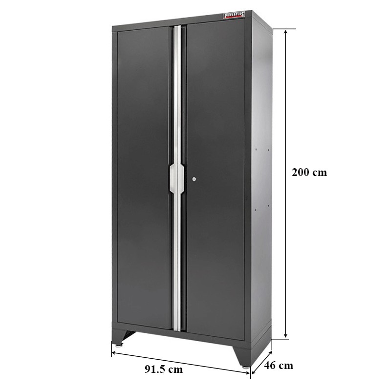 Chique matzwarte werkplaatskast met twee deuren en vier in hoogte verstelbare legborden. Deze gereedschapskast wordt standaard geleverd met 4 verstelbare pootjes in het basisframe waarmee oneffenheden in de vloer kunnen worden opgevangen.