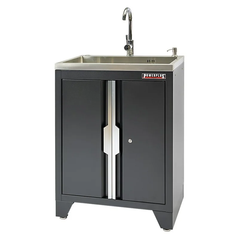 Werkplaatskast met 2 deuren inclusief zeeppomp, RVS wasbak en waterkraan. Deze gereedschapskast wordt standaard geleverd met 4 verstelbare pootjes in het basisframe waarmee oneffenheden in de vloer kunnen worden opgevangen.